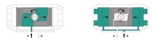 壓縮空氣從氣口A進(jìn)入氣缸兩活塞之間中腔時(shí),使兩活塞分離向氣缸兩端方向移動(dòng),兩端氣腔的空氣通過氣口B排出,同時(shí)使兩活塞的齒條同步帶動(dòng)輸出軸(齒輪)逆時(shí)針方向旋轉(zhuǎn)90度。 |