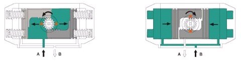 壓縮空氣從氣口A進(jìn)入氣缸兩活塞之間中腔時(shí),使兩活塞分離向氣缸兩端方向移動(dòng),迫使兩端的彈簧壓縮,兩端氣腔的空氣通過氣口B排出,同時(shí)使兩活塞的齒條同步帶動(dòng)輸出軸(齒輪)逆時(shí)針方向旋轉(zhuǎn)90度。 |